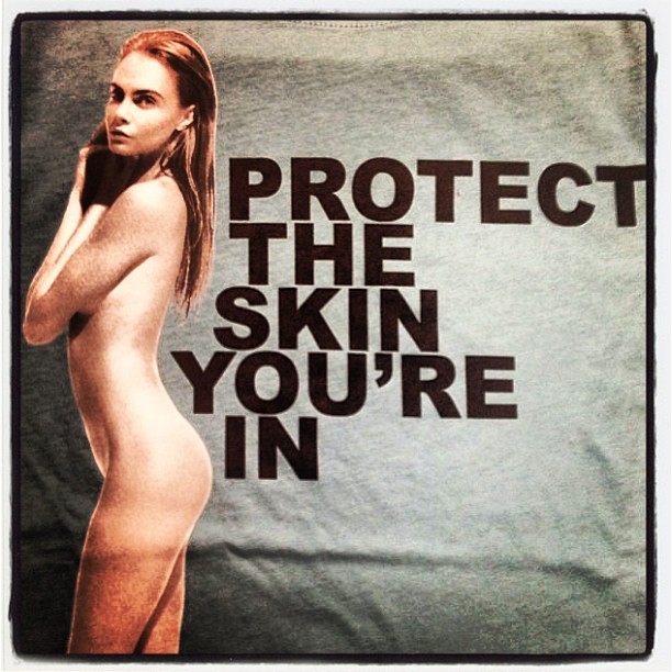 Past ‘Skin Tees’ faces – or should that be bodies – have included the likes of Kate Moss, Victoria Beckham, Naomi Campbell and Miranda Kerr. And now, Cara, whose strategically covered body appears on the front of the tee besides the slogan “Protect the skin you’re in”.