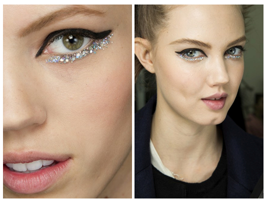 The makeup was under the charge of Peter Philips that evening. He matched matte skin, a delicate sweep of blush and lightly balmed lips with a dramatic eye look. A blunt black flick extended from the inner corner of the eye, right through to beyond the outer corner, with a similar shaped flick mirrored on the lower lid in thick-cut, iridescent glitter. The overall look was semi-classic with it’s 60s-esque black liner, yet entirely space-age in the same breath, the lower lash line coated in a constellation like flash of glitter.