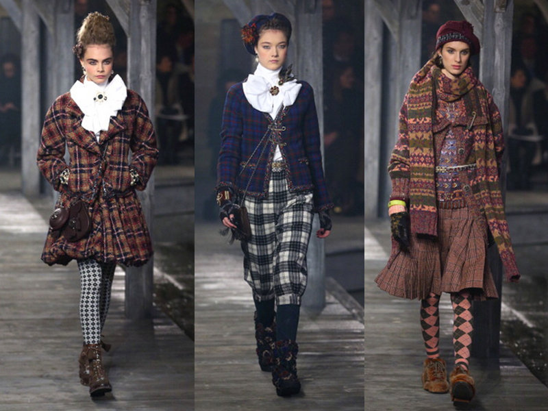 A true highland fling, models including Stella Tennant, Edie Campbell and Cara Delevingne stormed the runway in bejewelled knit wear, tartan and cashmere, with diamond, striped and houndstooth-patterned tights keeping the chill at bay and flat tough-luxe boots (perfect for striding the Scottish highlands).