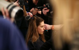 A model gets her hair done backstage before the Burberry Prorsum show during the 2013 Autumn/Winter London Fashion Week in London on February 18, 2013. AFP PHOTO/ANDREW COWIEANDREW COWIE/AFP/Getty Images