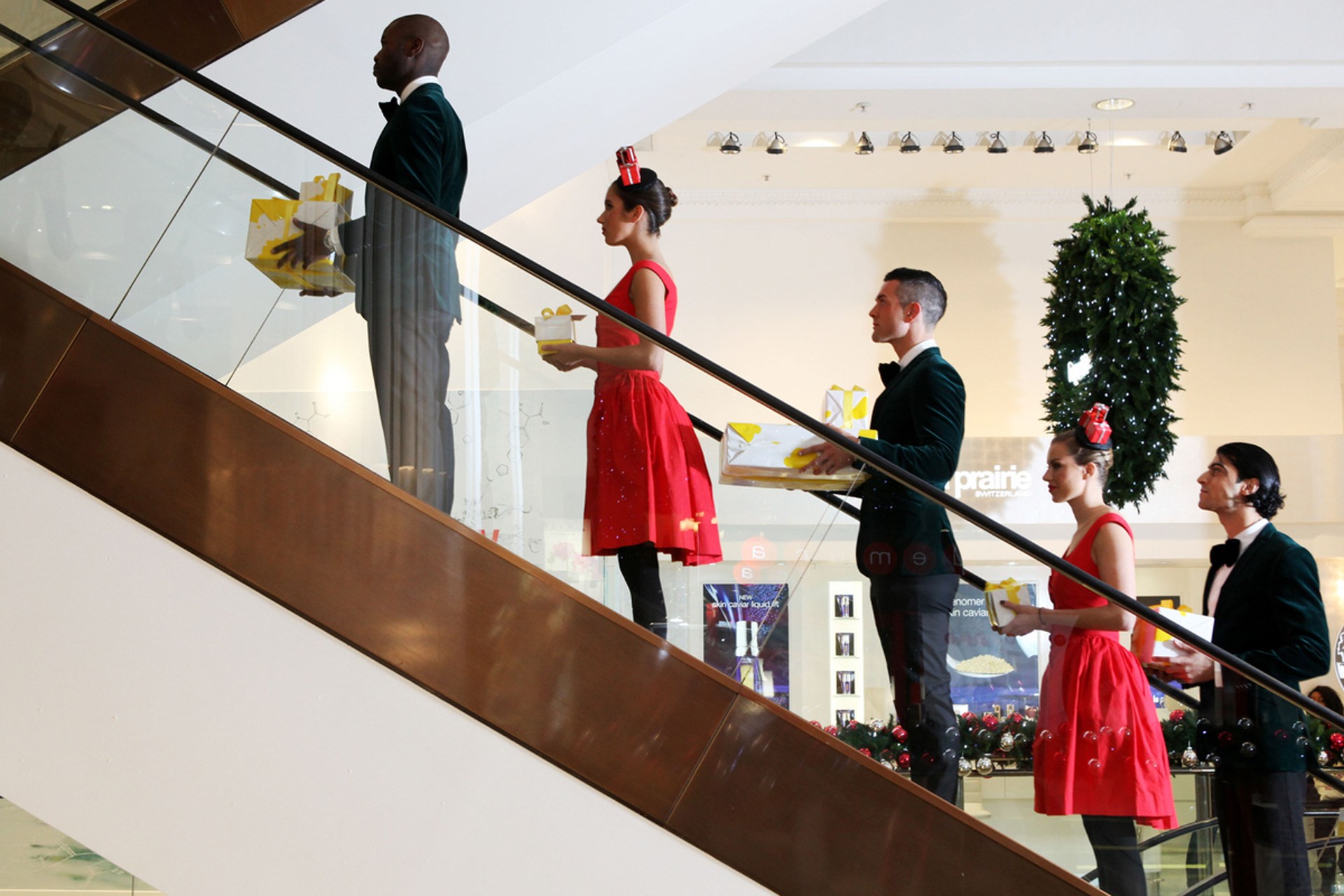 These Santa’s helpers are however not adorable little men in jingling hats and pointy shoes. Instead they are closer to fashion sugar plum fairies. The chaps are decked out in dapper suits, and the girls in chicly festive red Vivienne Westwood dresses paired with roller skates.