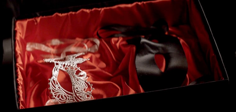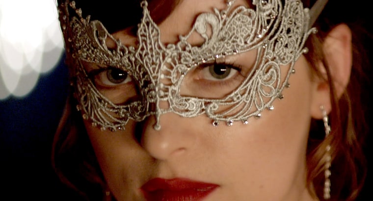 The short clip opens with fireworks, then flashes to Anastasia unwrapping a box with a lace grey mask inside. Behind her, standing over her shoulder, Christian whispers in her ear, “Intrigued?”.