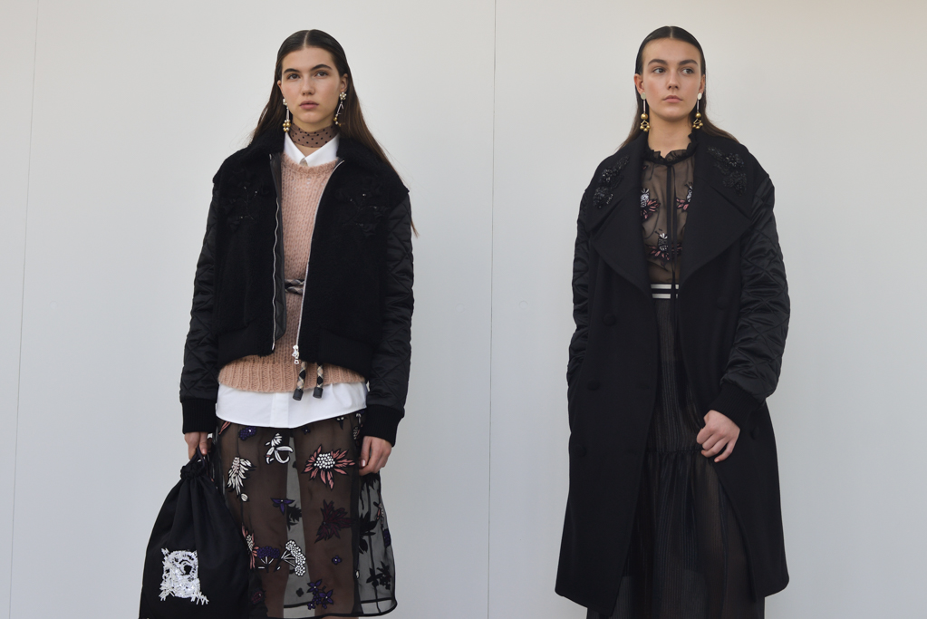 The models stood in two rows, posing unusually still, inviting us to take in the navy, black, and cream ensembles. Lighter blues with metallic hues livened up the collection. While the outfits seemed to focus on the importance of tailoring, at least regarding the pantsuits and frocks, the outerwear and accessories were oversized and statement worthy.