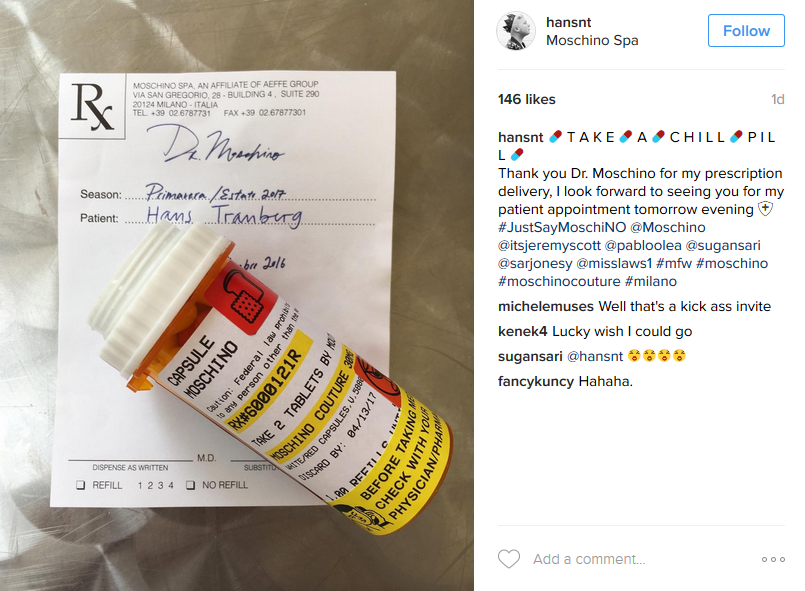 The invitation to the show was delivered in the form of prescription vials, where Moschino’s creative director, Jeremy Scott, prescribed us all a dose of erm…fashion? during his MFW SS17 show.