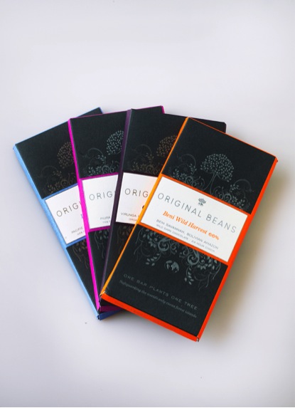 Original Beans launches with a range of high grade chocolate bars, 3 dark and 1 milk, sourced from endangered rainforests around the world. For every bar bought a new tree is planted and, not only that, but the farmers they work with get 6 times the standard fair trade rate.