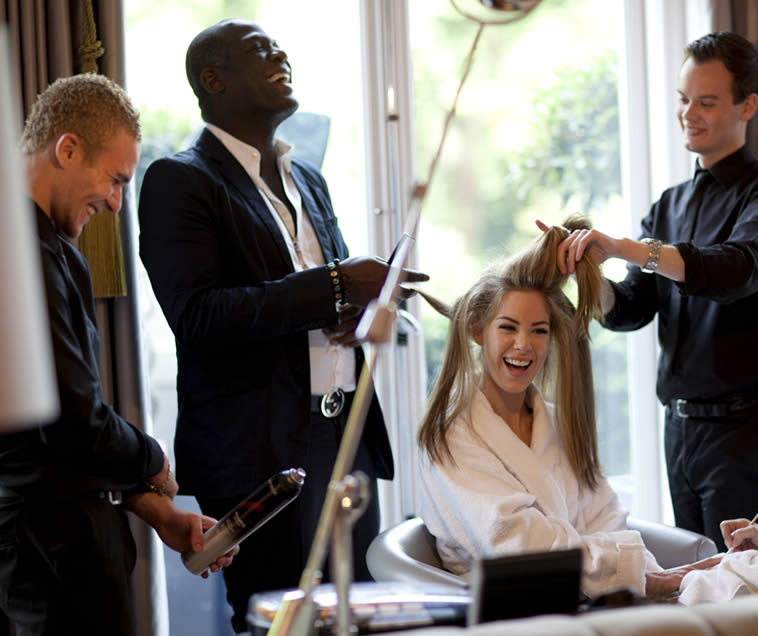 ‘A thick, glossy nape bun with a beautiful eyebrow skimming side parting from this red carpet veteran. Julianne nails it again. Mastering this classic event do will guarantee that heads turn every time. Focus on the blow dry and not disturbing the cuticles during the process – infuse moisture into the hair while wet with hydrating product and take the time to synchronise the dryer nozzle with the barrel brush for each section. Once dry run a straightener over each section to cement the smoothness. Side part before gently combing the hair, securing in a pony tail with a same colour, or clear, elastic. Pin into a bun at the nape in three sections to form a seamless circle. Pat all over gently with hairspray from the hands. I’d advise a colour gloss a few days before a big event to really lift colour and show it off at its best’.