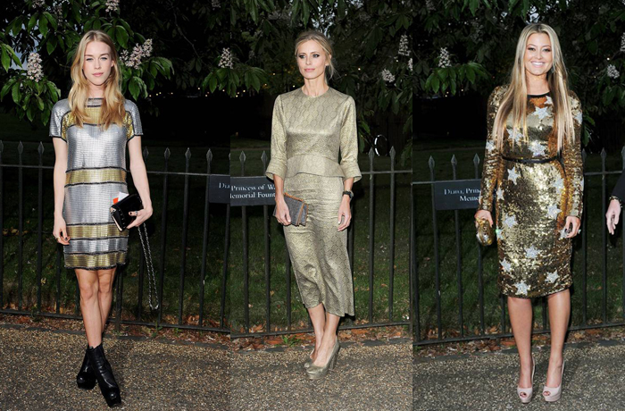 One of the hottest tickets of the summer, guests were appropriately attired for the occasion, with a heavy focus on this season’s molten metallic trend. Hot model and DJ of the moment, Mary Charteris, shimmered in a gold and silver striped sequin mini dress, accessorised with heavy black platform boots and clutch. Model Laura Bailey was, as always, the epitome of elegance and understated glamour, dressed in a gold brocade peplum dress with hair swept back into a simple chignon and flawless make up. Singer Holly Valance – who arrived with fiance Nick Candy, gleamed in a skintight golden-starred sequin dress.