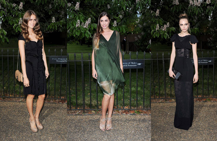 Despite it being a balmy summer night, understated monochrome and semi-sheer textures were also popular choices at the fundraiser, with both Jade Williams, aka singer Sunday Girl, and Burberry beauty Cara Delevigne opting for elegant, ruffled black dresses. Whilst Amber Le Bon, daughter of model Yasmin and Duran Duran singer Simon, wore a beautiful transparent sea green dress.