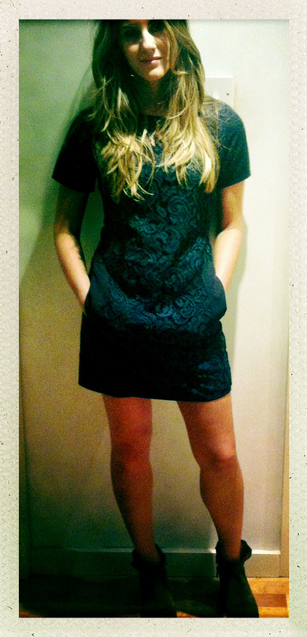 I plumped for this rather gorgeous navy less dress for daytime. The perfect mid-thigh length, it’s suitable and smart enough for office wear, but the peek a boo lace prevents it from looking to staid.