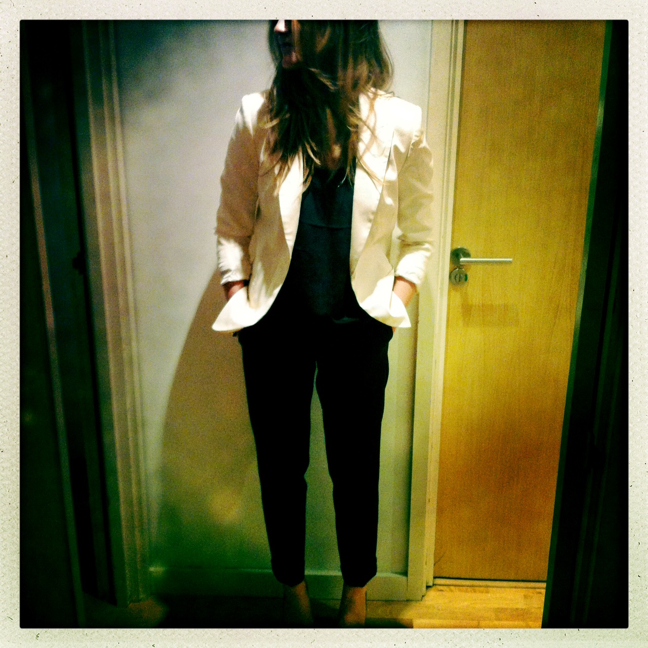 For night, I chose an all black cropped trouser and silk racer back tee pairing it with a blush blazer. As usual I was running late, which meant a mad dash sweep of mascara and a rather hurried sprint down the taxi (oh and this rather strangely post pic!) – Sure deodorant, keeping me fresh and dry.