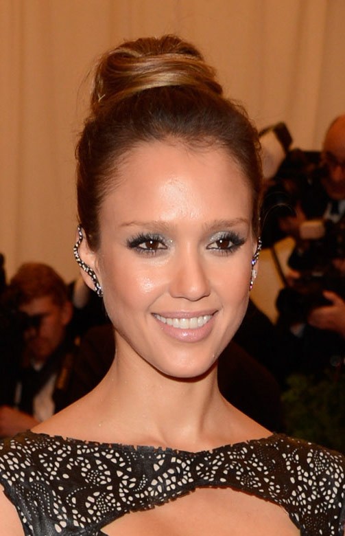 From headpiece to earpiece, we adore Jessica Alba’s doubled-up diamante ear cuffs. An inspired addition to her attire that offset a super-sleek topknot – and upside down braid that snaked down the bun to the nape of her neck (as can be seen below).