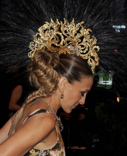 Punk-inspired head pieces were the order of the evening with Sarah Jessica Parker trailblazing the trend with a show-stopping custom-made Philip Treacy intricate gold-based mohican headpiece atop a beautifully coiled fishtail braid.