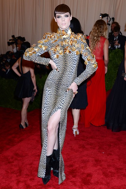 Model Coco Rocha embodied the theme flawlessly in an Emanuel Ungaro by Fausto Puglisi leopard gown. The black booties and edgy bob cut pulled together her fashionably punk ensemble.