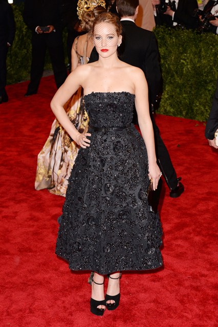 Ever the Dior ambassador, Jennifer Lawrence looked conservative and gorgeous in a strapless Dior gown, red lips and face-covering veil.