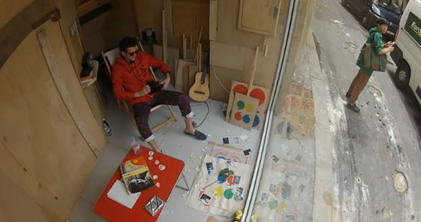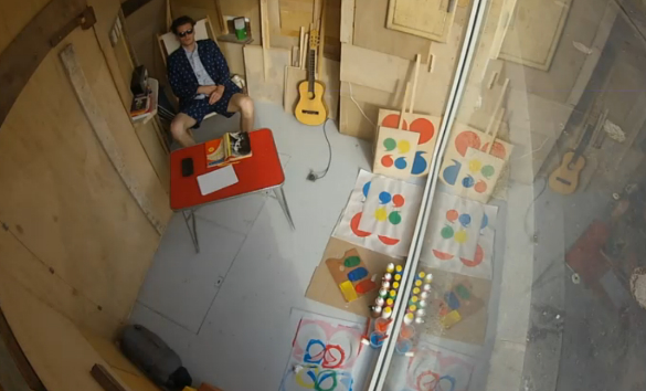 Located within a gallery window in Paris’ Le Marais district, the purpose-built compartment, made up of cardboard boxes and wooden planks, will be on view to passers-by 24/7, as well as being live streamed via the Band of Outsiders Tumblr page.
