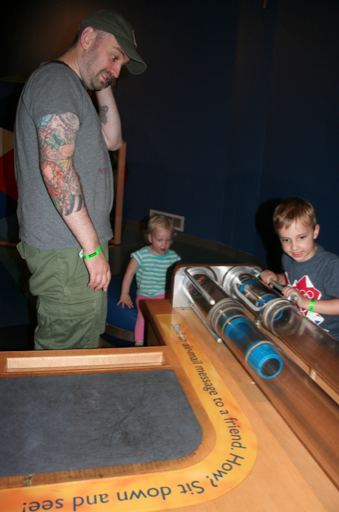 Put your message in the canister, then bounce on the seat at the very end to make the message travel down the tube. Pretty funny to watch children (& grown-ups…ahem) bouncing with such determination to push the message along.