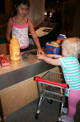 They also had this amazing toy supermarket set up, about the size of my local Tesco Express! Aisles with shelves of play-food, fruit and vegetables that kids could wheel their trollies around and pretend they were really shopping then even take everything to the till once they were done. It was heaven to my little girl, she was in her element here. And as you can see, she even found a friend at the till to ring up her bill of groceries. Museum staff would re-stack the shelves constantly. Genius.