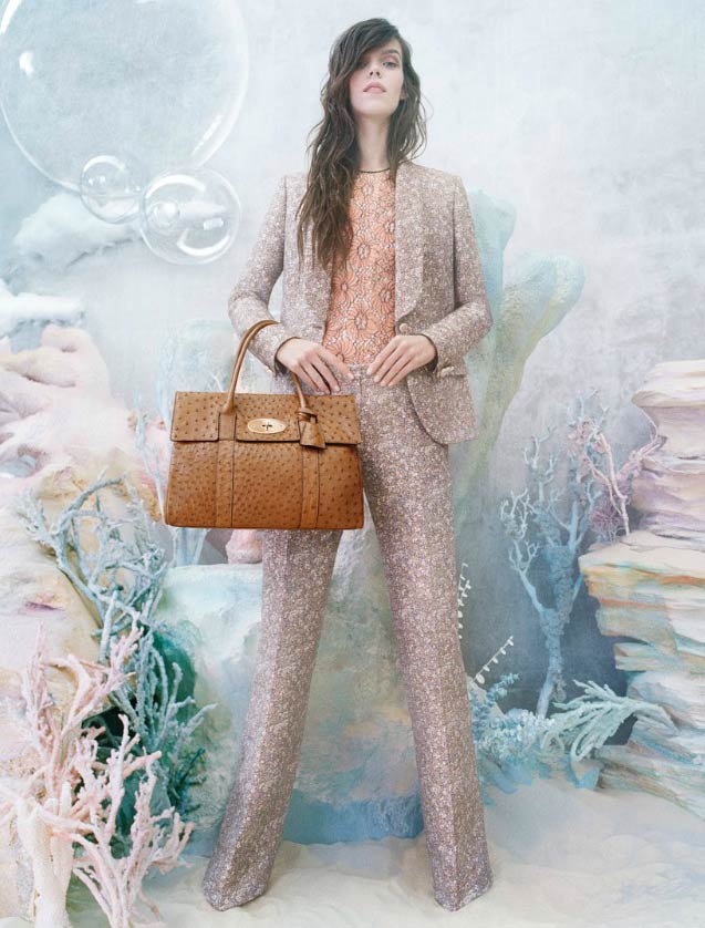 Shot in signature surreal style by photographer Tim Walker and art directed by Ronnie Cooke Newhouse, Canadian model poses as an ethereal and other-worldly mermaid. Set against an iridescent, pastelised dreamscape by Shona Heath, inspired by ‘the kaleidoscope of blossom and sorbet pastels’ that were used in the SS13 collection, Meghan wears a collection littered with barely-there pastel shades, tailored pieces and, of course, Mulberry’s scene-stealing bags.
